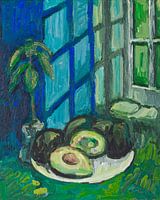 Een expressionistisch stilleven met avocado's in het Nederlandse licht. Het origineel is met losse, snelle kwaststreek neergezet door de Nederlandse kunstschilder Tanja Koelemij. Zij heeft als grote voorbeelden Pierre Bonnard , Vincent van Gogh en andere oudere (17de eeuwse) Hollanse/Nederlandse /Belgische kunstenaars zoals Pieter Claesz. Meer van haar werken zijn oa te vinden op Instagramaccount @artbykoelemij.