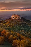Vooral in de herfst tonen de bladeren, bomen en bossen rond het kasteel zich in bijzonder mooie herfstkleuren. Als er een warme zonsondergang is, worden ze bijzonder goed en sfeervol geaccentueerd. Portretfoto. 230077ays