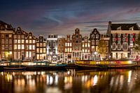In de grachtenpanden en de woonboten aan de Singel in Amsterdam branden lichtjes. In het water van de Singel reflecteert het beeld. De lucht toont nog net het kleurenpalet dat de onderstaande zon over de Amsterdamse werpt. De panden aan de Singel hebben een variatie aan gevels. Je vindt er o.a. trap- en klokgevels.