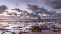 Stenen kust met scheepswrak ARMAS in het avondlicht