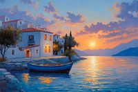De lucht en het water smelten samen in zachte pastelkleuren bij zonsondergang, terwijl een charmant huis met rode daken een idyllische achtergrond creëert. Het zachte kabbelen van de golven omringt de boot die ontspannen tegen een stenen gevel leunt en je uitnodigt om te dromen en te blijven hangen. Deze vredige omgeving straalt…