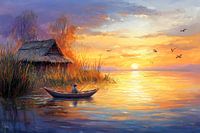 De lucht versmelt met het water in zachte kleurschakeringen, terwijl de zon achter de horizon zakt in de gloed van het avondlicht. Een eenzaam hutje aan de oever en een klein bootje nodigen je uit om te dagdromen, terwijl vogels zachtjes over het glinsterende oppervlak glijden. Vrede en harmonie doordringen het landschap en nodigen je…