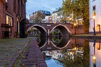 Avond bij de Vollersbrug over de Oudegracht in Utrecht met links de vroegere bierbrouwerij De Boog en achteraan de vroegere sigarenfabriek van Ribbius Peletier.