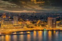 Het beeld toont stadsdeel de Jordaan in Amsterdam in de avond. De zon is onder en het kunstlicht van de verlichte gebouwen, o.a. de Westerkerk geeft een feeëriek beeld. De foto is zowel in kleur als zwart-wit beschikbaar.