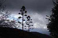 Grote agavebloemen tegen een donkere regenwolk in Andalusië.