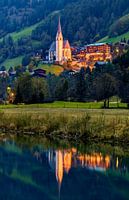 In het pittoreske dorpje valt vooral de kerk op, en die zien we hier bij avond met zijn reflectie in de rivier de Möll.