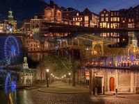 Foto collage van bekende plekken in Leiden tijdens de avond uren. De Hooglandsekerkgracht, de Zijlpoort, de Morsch poort, De waag en de reuzenrad tijdens 3 oktober