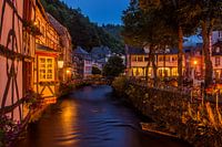 Traditionele huizen langs de rivier "Rur" in het centrum van het historische stadje Monschau in Duitsland.