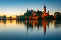 Uitzicht over het meer van Schwerin naar Kasteel Schwerin op een zomeravond