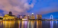Singapore is een stadstaat in zuidoost Azië. De stad wordt gekenmerkt door de vele moderne wolkenkrabbers, met als hoogtepunt de architectuur van het Marina Bay Sands Hotel en het reuzenrad, de Singapore Flyer. Deze foto is 's avonds tijdens het blauwe uur genomen.