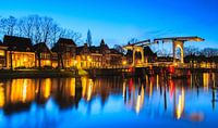 Avondfotografie van de verlichte ophaalbrug in Weesp tijdens het blauwe uurtje. Foto gemaakt vanaf de Ossenmarkt.