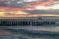 Na een mooie zonsondergang verschenen er prachtige kleuren in de lucht op het einde van de dag in Westkapelle, Zeeland, Nederland. Aan de horizon passeerde een ship de kustlijn die koers zette richting Vlissingen, het strand was leeg en snel zou het laatste daglicht verdwijnen.