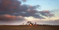 Noordpolder, bij Noordpolderzijl, Groningen. De late avondzon beschijnt een boerderij op de eenzame vlakte van de polder. Het sfeervolle beeld is typisch voor het Groningerlandschap. Deze foto is gepubliceerd in het boek Ruim Leven.
