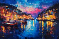 Een magische zee van kleur omhult de haven 's nachts, waar glinsterende lichtjes als fonkelende sterren over het water dansen. Zachte golven weerspiegelen de levendige sfeer terwijl de zilveren boten rustig deinen. De hemel, een vuurwerk van roze en violet, verleent het landschap een droomachtige magie die de ziel raakt.