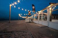 het is avond op het strand lichtjes versieren de ingang van een strandtent