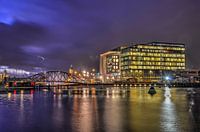 Dit kleurrijke avondbeeld van het Amsterdamse Oosterdok is gemaakt vanaf de kade bij het wetenschapsmuseum Nemo. Rechts zien we de nieuwbouw op het Oosterdokseiland met onder andere de bibliotheek en het conservatorium. Links daarvan overspant de Mr. J.J. van der Veldebrug het Oosterdok. Op de achtergrond zien we ook nog de koepel en de…