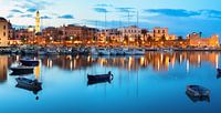 Avondgezicht op de jachthaven met verschillende boten. Oude stadswijk. Bari, Italië.