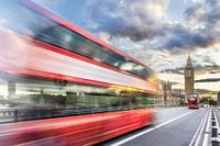 Deze dynamische opname toont een van de meest iconische locaties van Londen: de Westminster Bridge met uitzicht op de Elizabeth Tower (Big Ben) en de Houses of Parliament. Op de voorgrond raast een rode dubbeldekkerbus voorbij, een gestileerde beweging die het moderne, levendige Londen weergeeft. Het contrast tussen het gouden licht van de avondsfeer, de majestueuze architectuur en de snelheid van het stadsleven maakt deze foto tot een indrukwekkende momentopname van de Britse identiteit in de overgang tussen traditie en het heden.