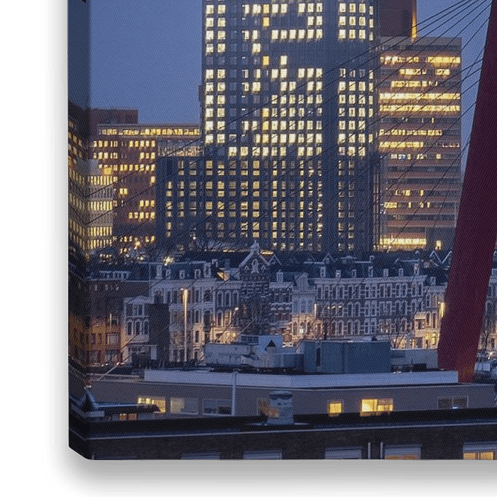 Koop de Rotterdam foto Avondfoto skyline Rotterdam 2018 van Mark De Rooij op canvas, aluminium dibond, (ingelijste) fotoprint, behang en ArtFrame, op maat geprint in Fine-Art kwaliteit.