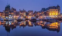 Het was het blauwe uur, dat magische moment tussen dag en nacht. De gevels waren warm verlicht, de boten lagen stil, en het water was zo glad dat het de stad als een perfecte spiegel terugkaatste. Vanaf mijn gekozen standpunt kreeg ik precies die symmetrie en diepte die ik voor ogen had.