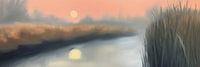 'Avondgloed aan de Waterkant' legt de rustige essentie van een schemerig rivierlandschap vast, met de ondergaande zon die een zachte gloed over het water werpt. Het riet aan de oever is nog net zichtbaar tegen de vermenging van warme en koele tinten in de lucht, waardoor een vredige symfonie van kleuren ontstaat die de kalmte van de avond belichaamt.