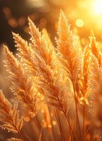 Het pampagras bij zonsondergang biedt een adembenemend tafereel van elegantie en warmte. De lange, delicate grassprieten gloeien in warme kleurschakeringen, van zacht goud tot intens rosé, wanneer de ondergaande zon haar laatste stralen over het landschap werpt. De filigreine bloeiwijzen, met een gouden glans, wiegen in de avondbries, terwijl de grassen dansen in de magische sfeer van de zonsondergang.