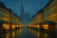 Dit schilderij bevindt zich in het sfeervolle hart van de Elzas en toont de kerstmarkt van Straatsburg, die bekend staat als een van de oudste en meest betoverende van Europa. De scène ontvouwt zich langs een geplaveide straat die leidt naar de majestueuze kathedraal, waarvan de spits zachtjes vervaagt in het mistige blauw van de avond.…