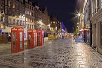 De Royal Mile is een opeenvolging van centraal gelegen straten in de oude binnenstad van Edinburgh, die van Edinburgh Castle naar Holyrood Palace leidt. Hier op het hoogtepunt van de High Street met de typische rode telefooncellen. Aangename rustige avondsfeer na een korte regenbui.