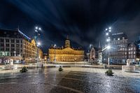 Deze foto van een lege Dam is gemaakt tijdens de Avondklok in Amsterdam gedurende de corona-pandemie.