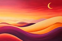 Zachte heuvels in warme rode tinten vermengen zich elegant met een zachte paarse tint, terwijl een delicate maan glinstert in de lucht. Deze harmonieuze compositie creëert een gevoel van rust en sereniteit, ideaal voor een slaapkamer, waar het ontspannende droomscenario's introduceert en de ziel kalmeert.