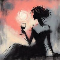 Een vrouw zit ontspannen met een glas wijn in de avondzon, haar blik afwezig maar betekenisvol. In houtskool en zachte pasteltinten wordt een moment van stille overgave vastgelegd. De compositie ademt rust, kwetsbaarheid en kracht tegelijk. Licht en schaduw spelen subtiel over haar contouren. Een beeld dat blijft hangen, als een fluistering in de schemering.
