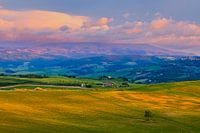 Het laatste licht van een lente dag valt over het mooie Toscaanse heuvellandschap in Val d'Orcia, gelegen tussen San Quirico d'Orcia en Pienza in midden-Italië.