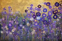 "Avondlicht in het Bloemenveld" toont een veld vol paarse en blauwe bloemen, verlicht door het zachte gouden licht van de ondergaande zon. De bloemen variëren in tinten van diep paars tot licht blauw, met enkele witte bloemen die subtiele accenten toevoegen. De achtergrond is een warme mix van goud en aardetinten, wat het werk een rustige en serene sfeer geeft. Dit werk, geïnspireerd door de natuurlijke schoonheid van bloemenvelden bij schemering, vangt de rust en stilte van een zomerse avond. Perfect om een gevoel van kalmte en elegantie in elke ruimte te brengen.