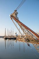 Het Friese havenstad Harlingen aan de Waddenzee in het avondzonnetje met enkele zeilschepen gespiegeld in het stilstaande water op een windstil moment.