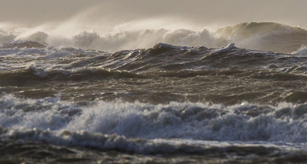Zon schijnt op de branding van de Noordzee bij de buitenwatering van Katwijk. Golven rollen waarbij licht en wind opwaaiende druppels belicht bij zonsondergang met contrast rijke donkere achtergrond.