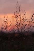 Verticale natuurfoto met zonsondergang op de achtergrond. Deze foto is genomen in het Lauwersmeergebied. Door de zonsondergang heeft de foto een zachte, rode achtergrond.