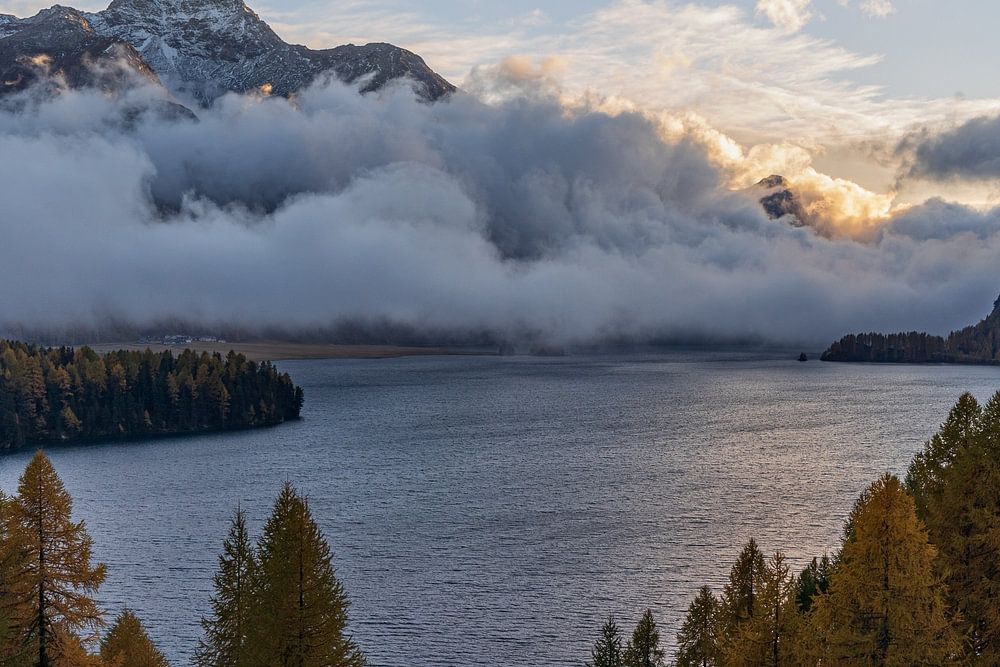 Avondsfeer aan het meer van Sils in Graubünden