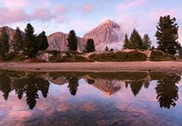Het warme licht werd nog steeds prachtig weerspiegeld in het meer met de bergen en wolken.