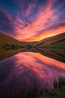 Een majestueus kleurenspel ontvouwt zich in de lucht, terwijl de glooiende heuvels en het rustige meer een harmonieuze relatie vormen. De levendige oranje en violette tinten nodigen uit tot dromen en creëren een ontspannen sfeer. Dit kunstwerk is perfect voor de slaapkamer om rustgevende momenten te creëren.