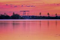 Typische Hollandse ophaalbrug bij de Kraaijenbergse Plassen. Kort na zonsondergang na een warme zomerdag, terwijl de lucht rood kleurt.