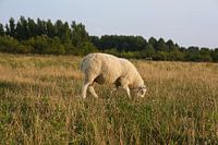 In de zachte gloed van de vroege avondzon staat een enkel schaap rustig te grazen. Het lange gras om hem heen vangt het gouden licht en beweegt zachtjes in de zomerbries. De warme tinten en het serene moment stralen pure rust uit, alsof de tijd even stilstaat. Een intiem beeld van landelijke eenvoud en de kalmte van het platteland.