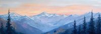 'Avondschijn op de Bergkammen' is een panoramisch kunstwerk dat de laatste stralen van de zon over een rij majestueuze bergtoppen vastlegt. De bomen op de voorgrond staan in silhouet tegen de levendige kleuren van de hemel, waardoor een diep contrast ontstaat met de koele sneeuwtonen. Dit beeld ademt de pure schoonheid van de natuur uit en brengt de vredige stilte van een berglandschap tot leven.