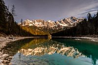 Stilte, natuur en een indrukwekkend panorama. s Avonds aan de Untersee in Grainau. De Wetterstein bergen worden weerspiegeld in het heldere water. De tijd lijkt stil te staan. Een prachtig moment in een fabelachtige natuur.