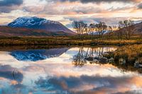 Een besneeuwde berg wordt weerspiegeld in een meer in de Schotse Hooglanden. Het laatste licht van de ondergaande zon bereikt nog de wolken.