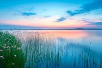 In het zachte licht van de schemering wordt de hemel weerspiegeld in het heldere water, terwijl zacht riet op de voorgrond sierlijk wiegt in de wind als kalme schildwachten. De pastelkleurige wolken creëren een harmonieuze achtergrond die de ziel kalmeert en uitnodigt om te dromen. Een vredig moment waarin natuur en rust één worden.