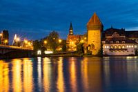 Blauw uur in Konstanz bij de Rijnbrug. De lichten worden in verschillende kleuren gereflecteerd in de Seerhein. Fantastisch.