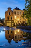 Weerspiegeling van de monumentale panden aan de Oudegracht in Utrecht in een waterplasje op de monumentale Vollersbrug.