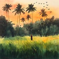 Het landschap straalt in een gouden licht, terwijl silhouetten met palmbomen de lucht in rijzen. Een man staat verloren in het hoge, zacht wiegende gras, omgeven door de rust van de natuur. Boven hem vliegen vogels in formatie, een symbool van vrijheid, terwijl de zonsondergang de horizon baadt in een warm, uitnodigend kleurenspel.