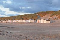 Strandhuisjes op een rij in het zachte licht van de ondergaande zon op het eiland Texel bij Paal 15