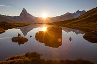 Avondstemming bij de Matterhorn. De foto is genomen bij de Stellisee boven Zermatt in de Zwitserse Alpen. De ondergaande zon zet het landschap in een prachtig warm licht. Een vrouw zit relaxed te genieten op een rots in het water.